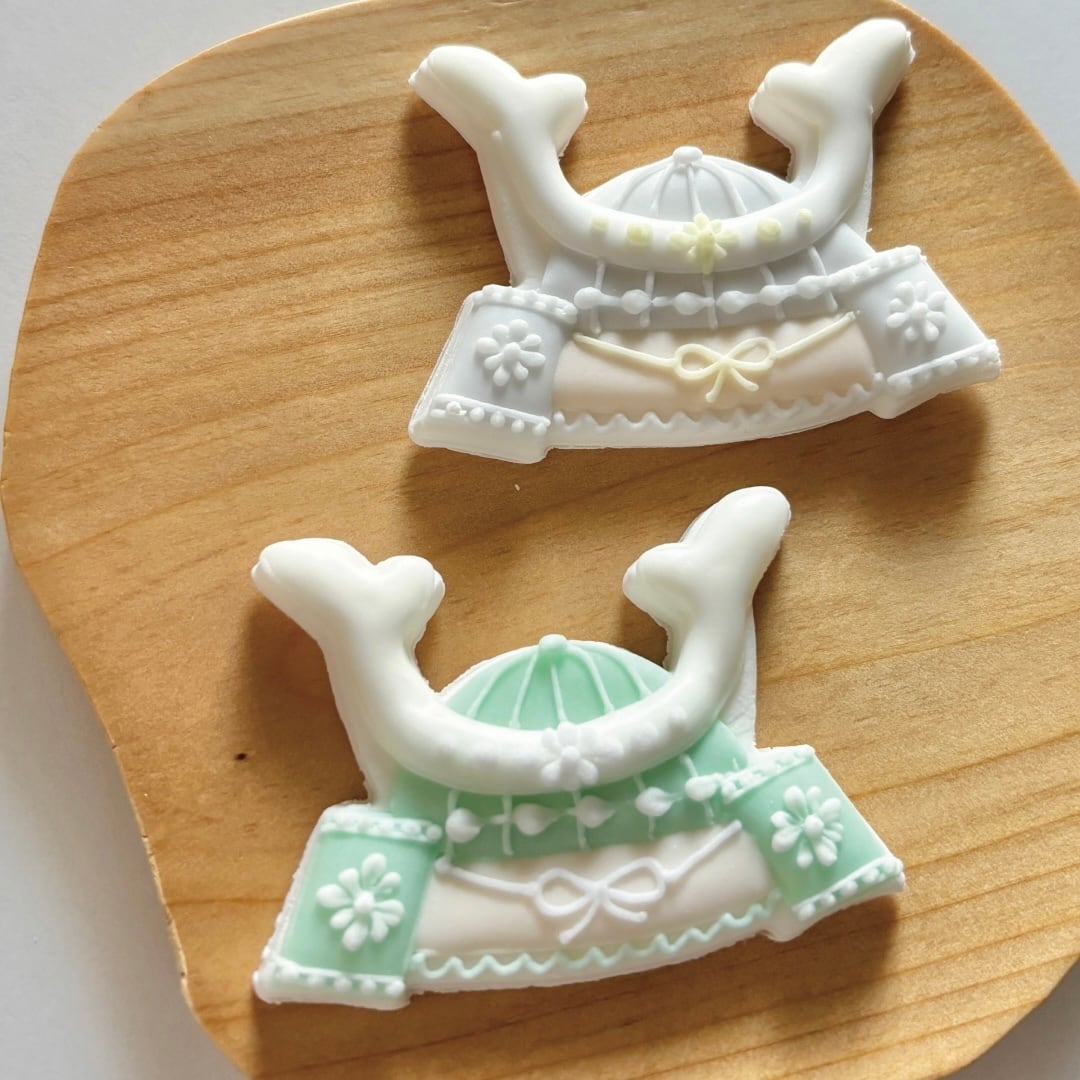 細かい装飾や模様が施された兜は、アイシングクッキー作家nijiiro shopがひとつひとつ手作業で作成しております。